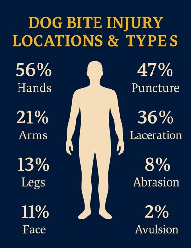 These are common among adults who instinctively try to push the dog away or protect someone else. These injuries are often overlooked initially but can lead to long-term physical therapy needs.